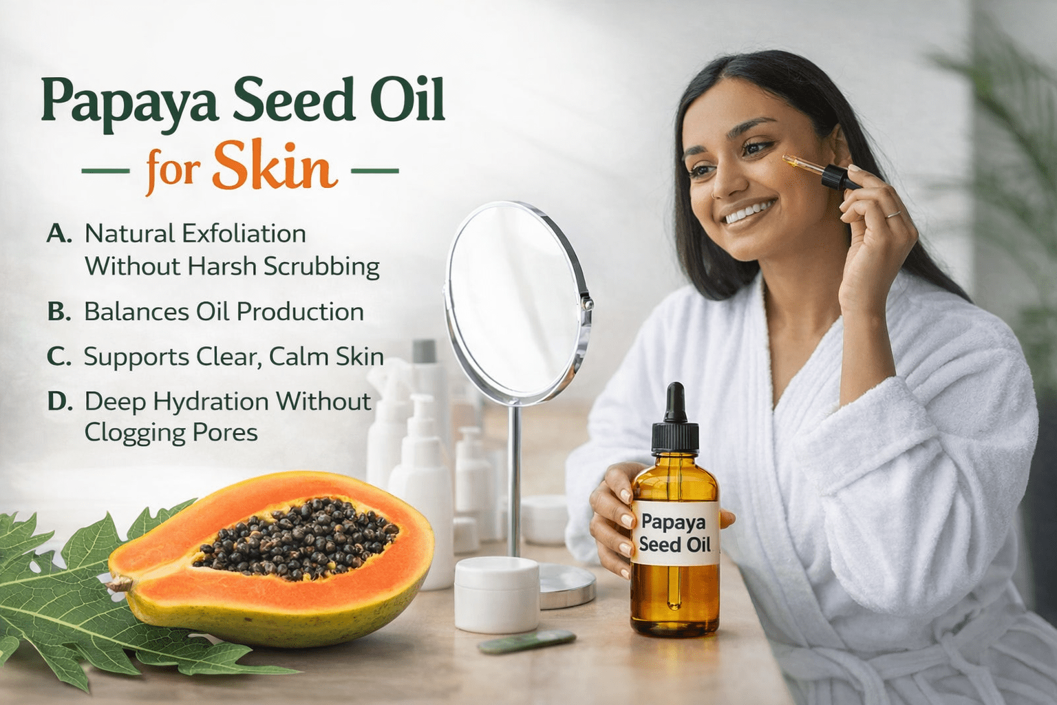 One of the great advantages of papaya seed oil is its versatility — you can incorporate it into your skincare routine in multiple ways.